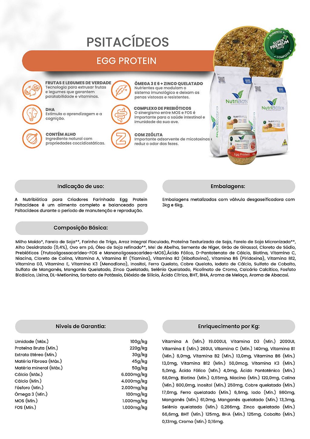 Fornecer como única fonte de alimentação. Podem ser oferecidos sementes, frutas, legumes e verduras como enriquecimento ambiental, desde que não ultrapasse 20% do total diário consumido. O alimento Nutribiótica Farinhada Egg Protein Psitacídeos deve estar sempre disponível em comedouros limpos e secos. É recomendável um período de adaptação de 4 a 8 semanas ao fornecer o novo alimento pela primeira vez e observar se o animal realmente está bem adaptado antes da substituição total.