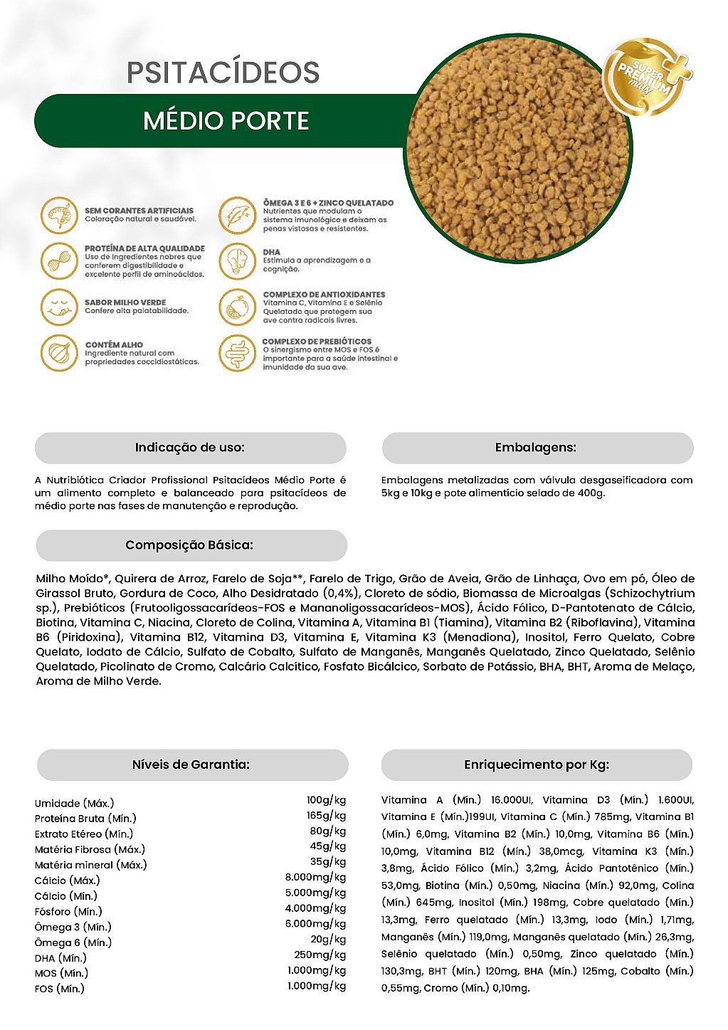 Fornecer como única fonte de alimentação. Podem ser oferecidos sementes, frutas, legumes e verduras como enriquecimento ambiental, desde que não ultrapasse 20% do total diário consumido. O alimento Nutribiótica Criador Profissional Psitacídeos Médio Porte deve estar sempre disponível em comedouros limpos e secos.