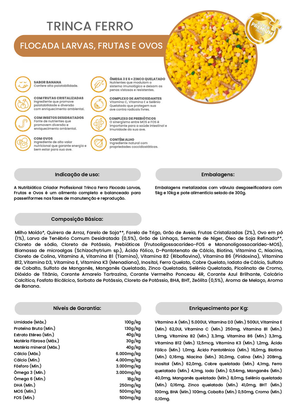 A Nutribiótica Criador Profissional Trinca Ferro Flocada Larvas, Frutas e Ovos é um alimento completo e balanceado para passeriformes nas fases de manutenção e reprodução.